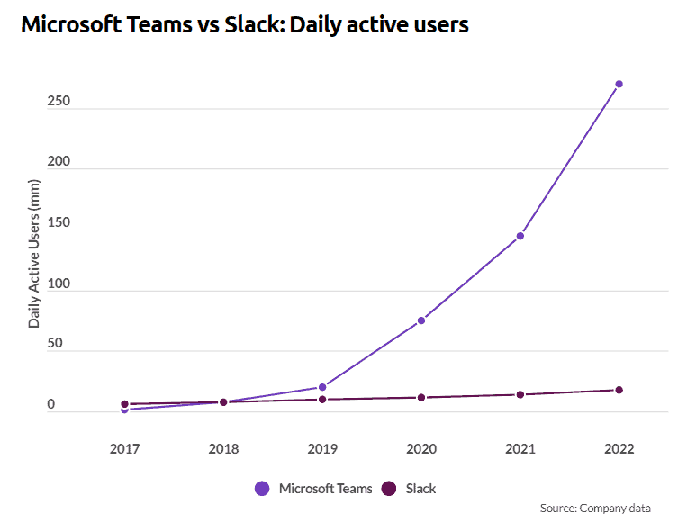 I was reading the last Naavik Digest the other day, Distribution is Everything, and it reminded me of the famous Slack vs. Microsoft Teams growth graph. It took Microsoft just four years to surpass Slack…